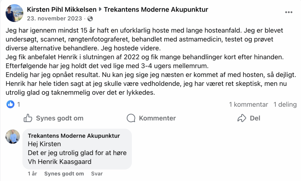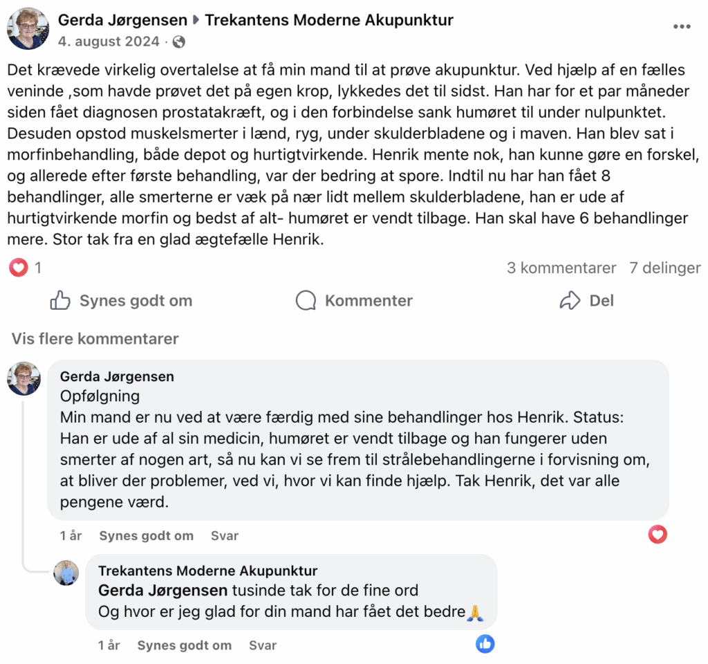 Jeg har haft knæsmerter i gennem det sidste halve år, men efter jeg er startet med behandling med akupunktur hos Henrik, er mine knæsmerter mindsket betydeligt. Jeg har haft smerter ifm. mit arbejde, familie og træning. Jeg er nu stoppet med smertestillende, og det er jeg rigtig glad for. . Kan varmt anbefale Trekantens Moderne Akupunktur.